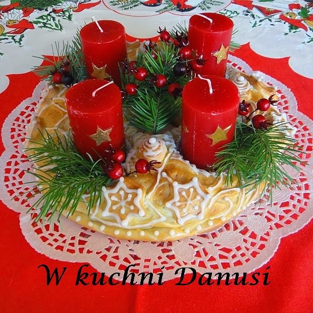 Upiekłam wieniec adwentowy, do którego wstawia się 4 świece. Każdego wieczoru niedzieli adwentowej zapala się kolejno świece -  katolicy odmawiają modlitwę.W wieczór wigilijny zapala się wszystkie świece, których światło oznacza nadzieję.